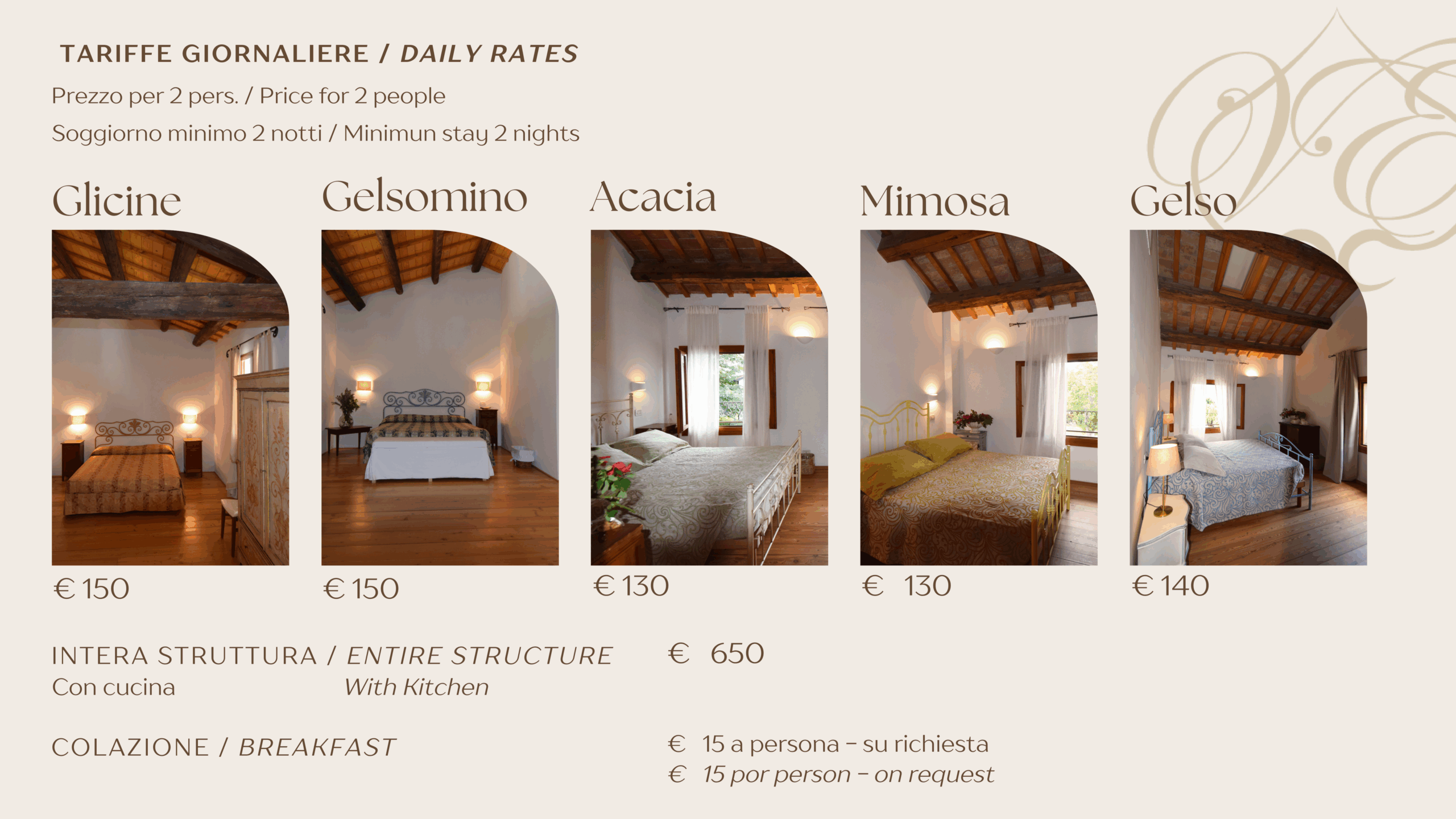 Al momento dell’arrivo verrà richiesta a titolo di cauzione la somma di 50 euro. L’importo verrà restituito alla partenza in assenza di danni rilevati dal personale. Ai signori ospiti verranno consegnate le chiavi del portoncino d’entrata alle camere e della camera prenotata.